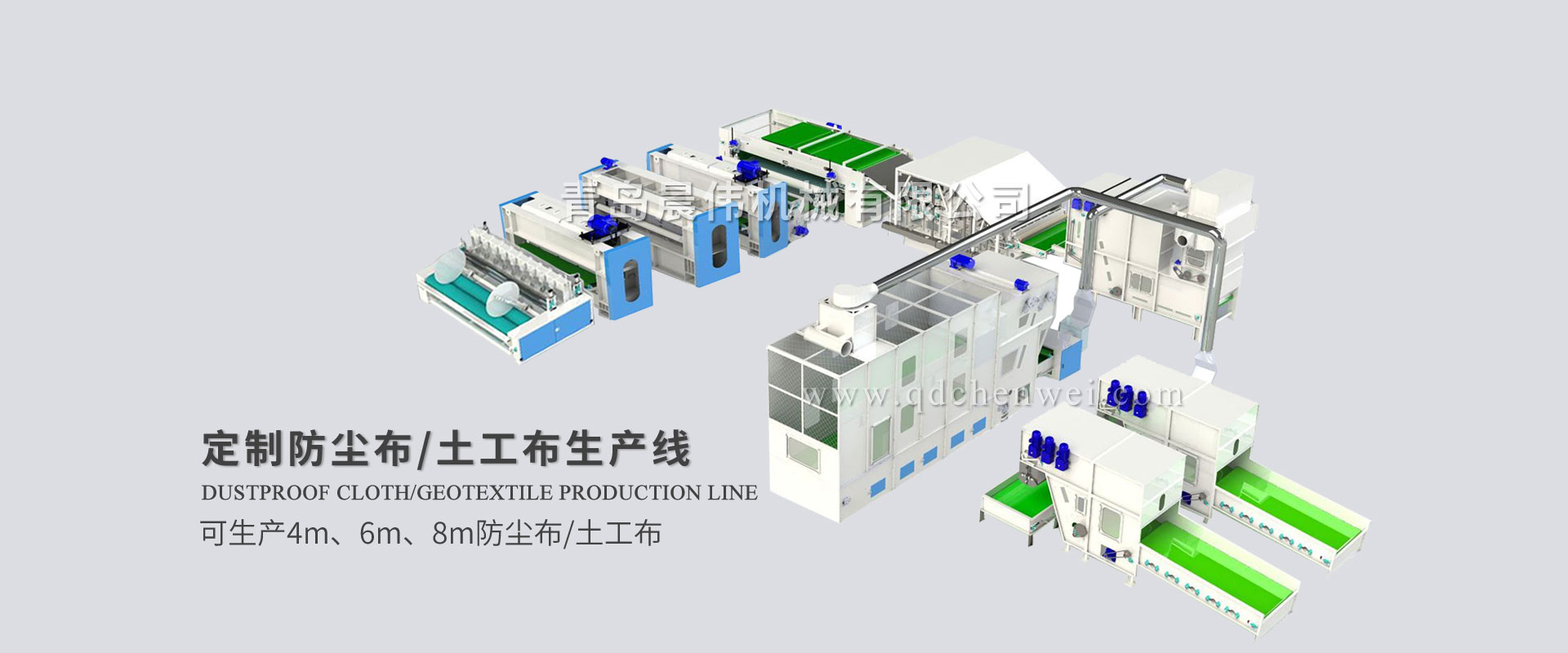 青岛晨伟机械有限公司 专业设计定制各类无纺布单机设备及生产线。 我公司主要产品:电子秤重开包机、开松机、给棉机、气压棉箱、(高速)单锡林双道夫梳理机、(高速)双锡林双道夫梳理机、铺网机、中速针刺机、高速针刺机、烘箱/烘房、烫光机、热轧机、收卷切片机,无纺布设备、仿丝棉设备、防尘布设备、喷胶棉设备、无胶棉设备、硬质棉设备、土工布设备生产线、椰棕床垫生产线、大棚保温被生产线、蚕丝被生产线、床上用品设备等各种无纺布机械设备。